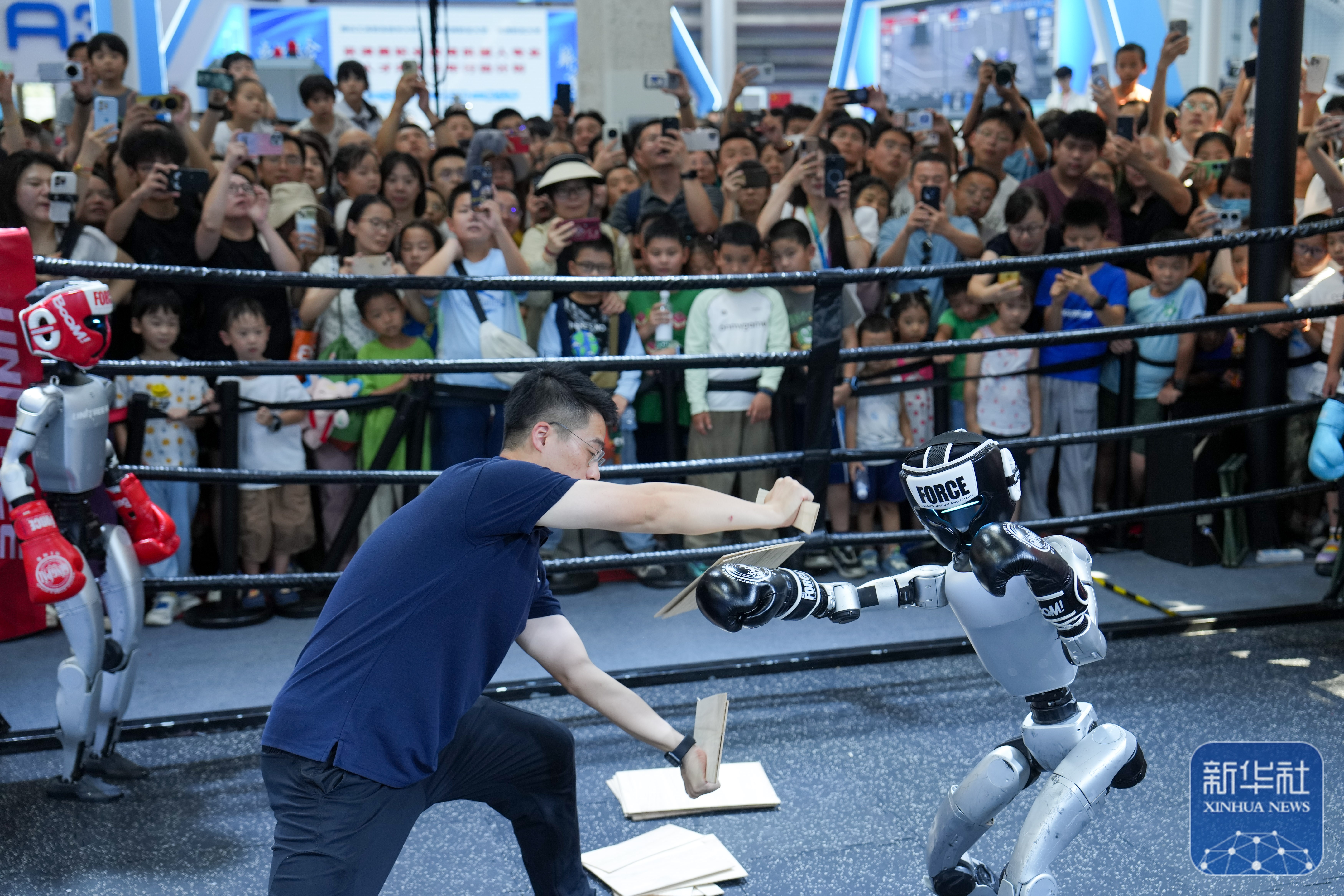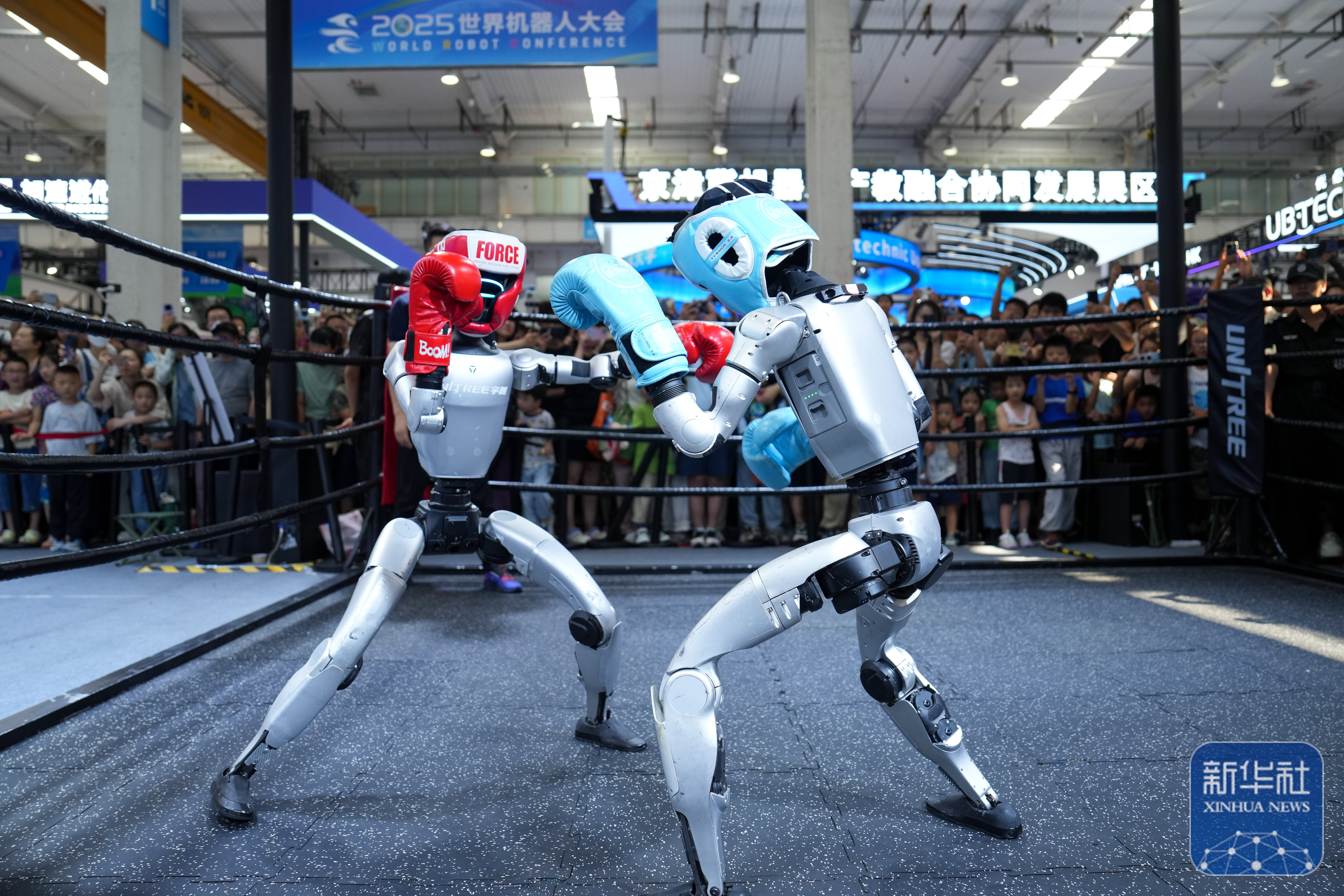 ↑ 谢天下机器东说念主大会展馆内,不雅众在宇树机器东说念主展台不雅看机器东说念主拳击展示(8月11日摄)。