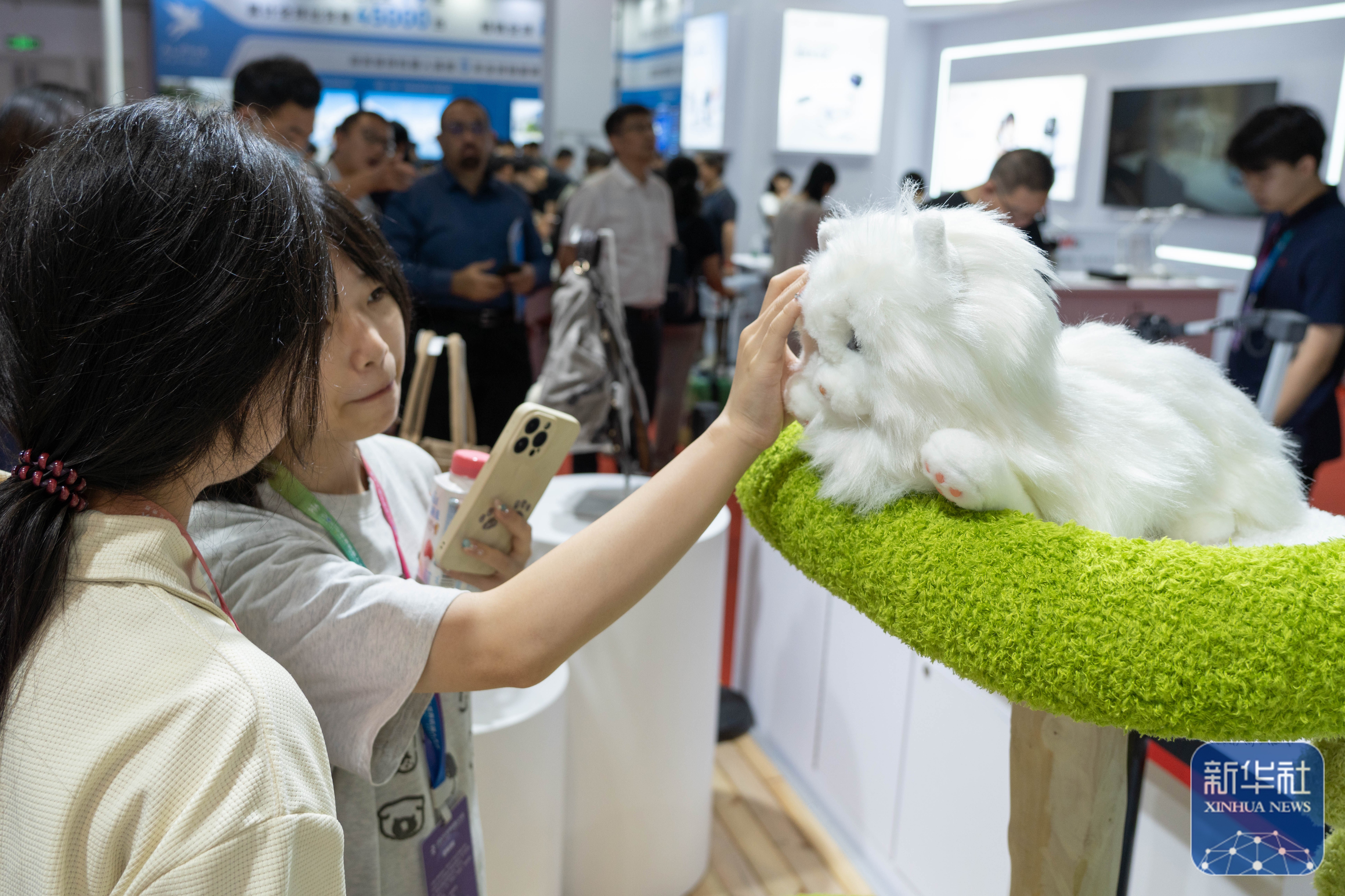 ↑ 谢天下机器东说念主大会展馆内,不雅众与一款机器宠物互动(8月8日摄)。
