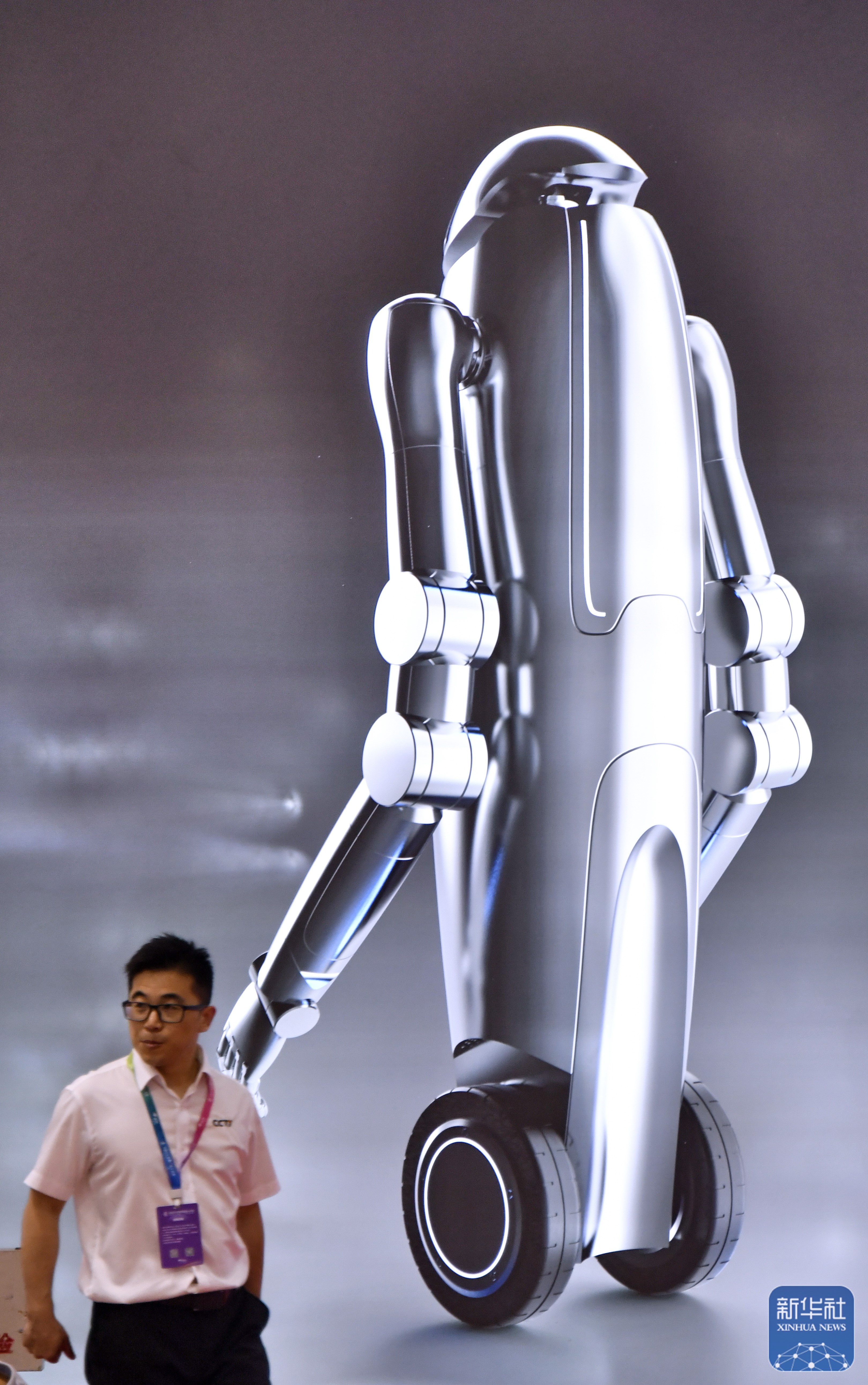 ↑ 谢天下机器东说念主大会展馆内,不雅众在参不雅展出的一款东说念主形机器东说念主灵敏工场自动化检测系统(8月11日摄)。