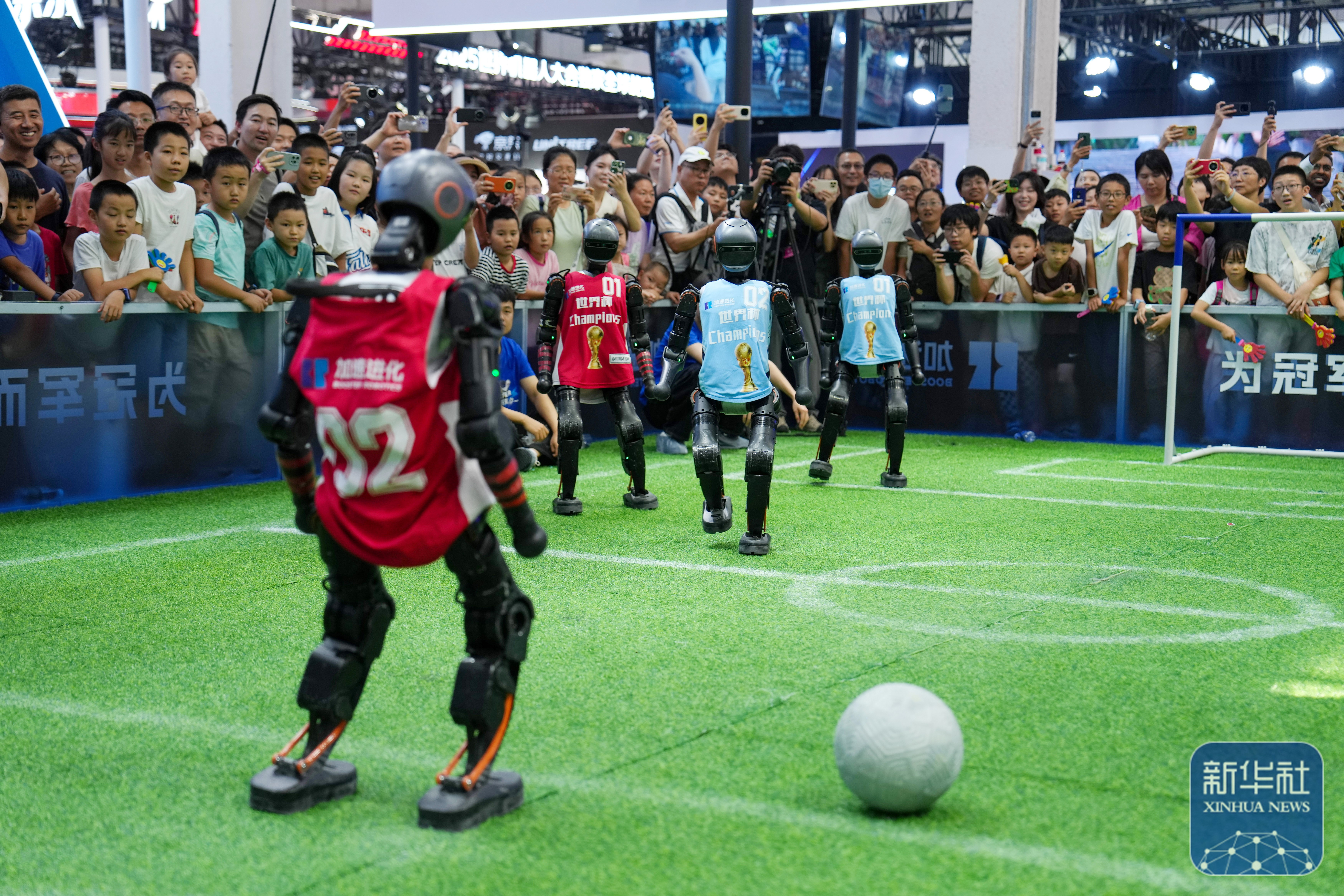 ↑ 谢天下机器东说念主大会展馆内,不雅众在加快进化公司展台不雅看东说念主形机器东说念主足球赛演示(8月11日摄)。