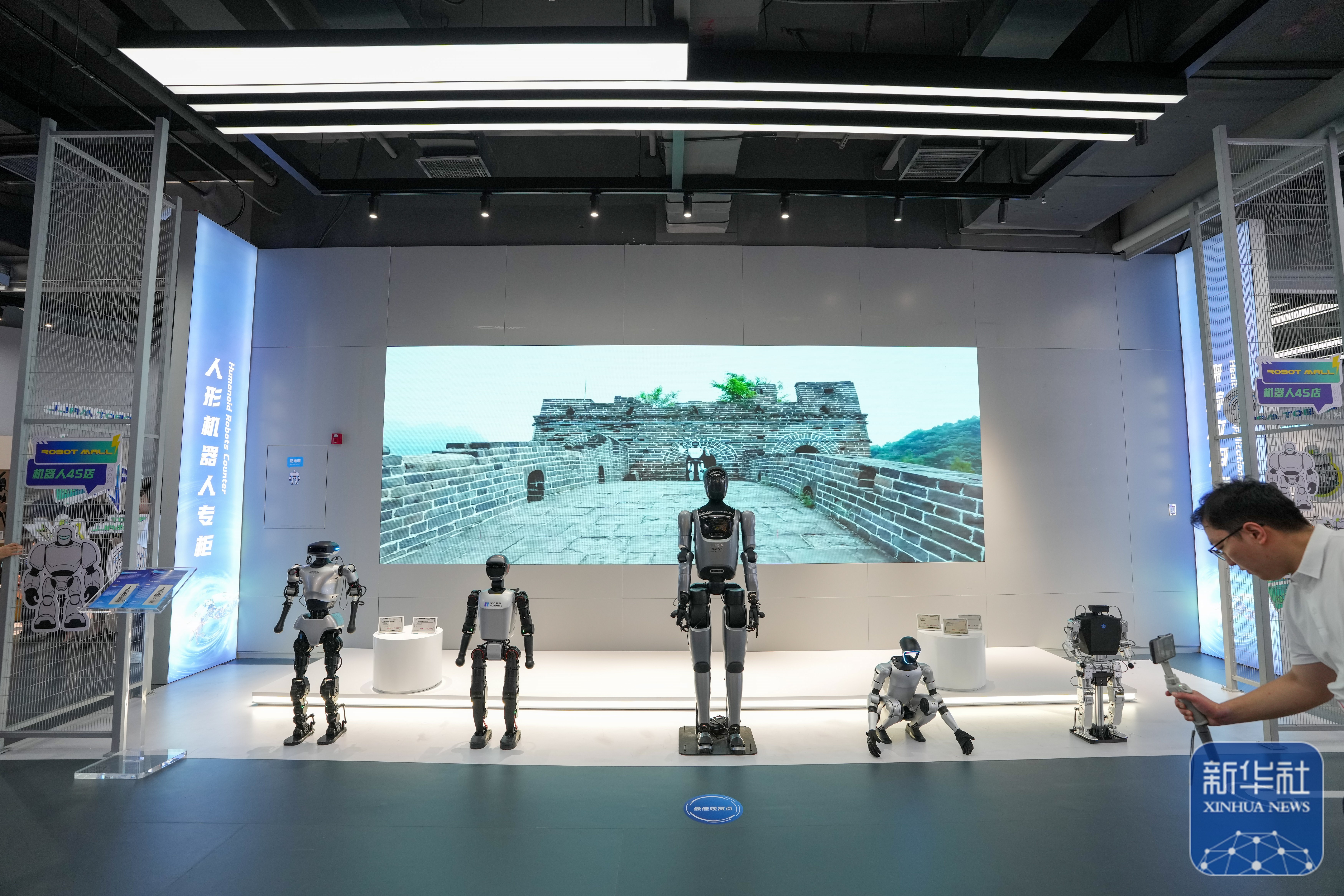 ↑ 在位于北京经开区机器东说念主大天下的各人首个具身智能机器东说念主4S店(ROBOT MALL)内,不雅众参不雅展出和可供出售的东说念主形机器东说念主(8月6日摄)。