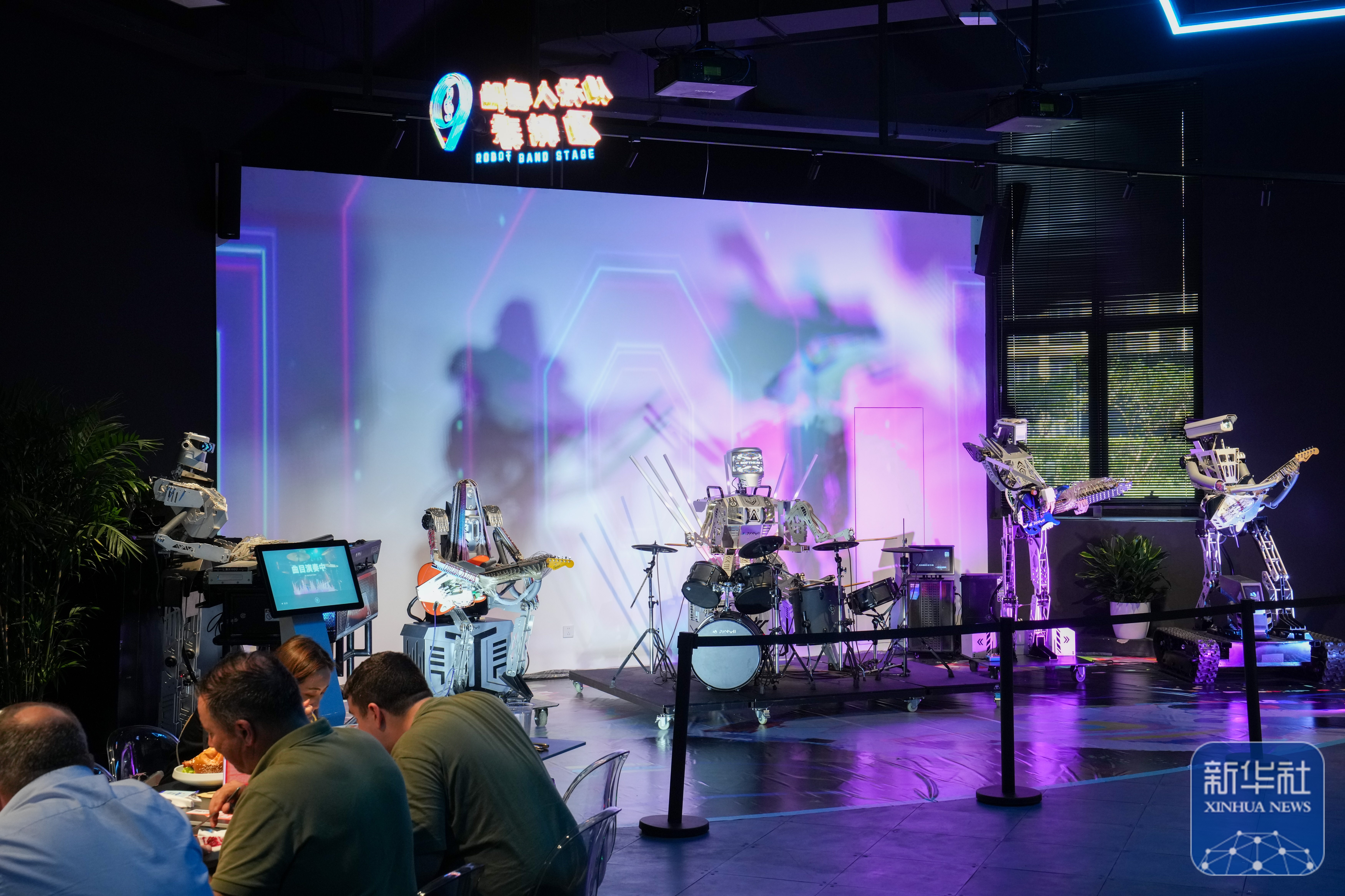 ↑ 在位于北京经开区的“机器东说念主焰究所”主题餐厅内,机器东说念主乐队在进行饰演(8月6日摄)。