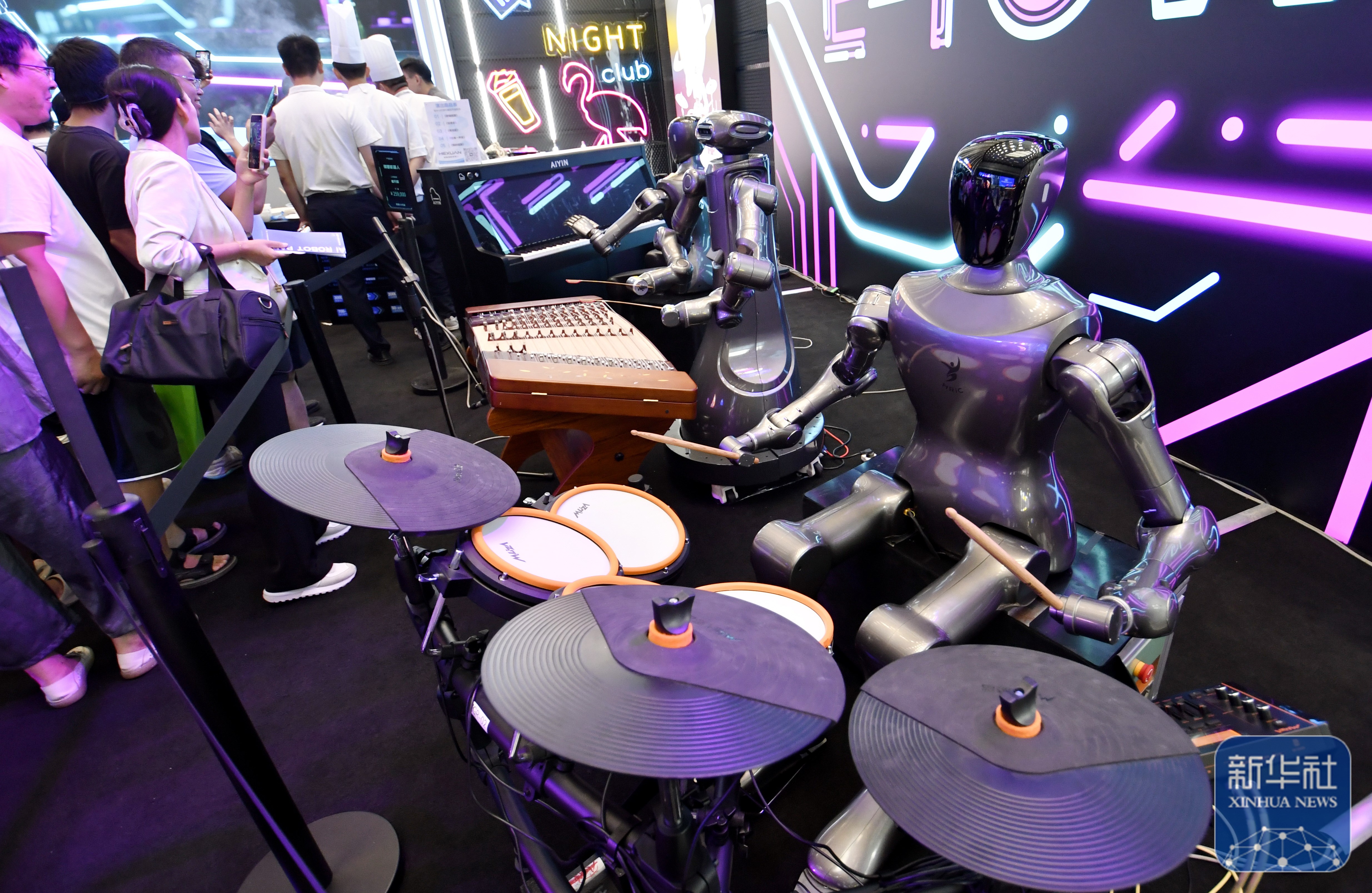 ↑ 2025天下机器东说念主大会上展示的智能机器东说念主乐队(8月8日摄)。